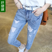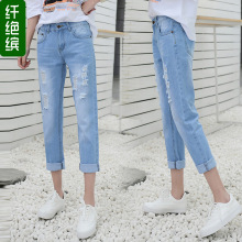2017春夏季新款韩版浅色破洞牛仔裤女高腰宽松学生九分裤哈伦裤子