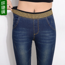 春夏女式松紧腰牛仔裤长裤高腰大码小脚紧身九分裤修身高弹力薄款