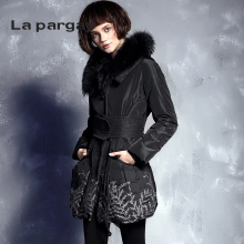 纳帕佳冬季新款绣线装饰印花大毛领配腰带收腰夹棉中长款棉衣