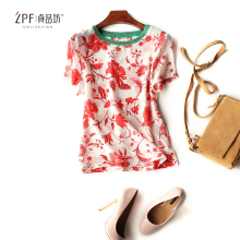 贞品坊2017春季新款瞬间出彩~圆领短袖红花真丝衬衫上衣女AS1541