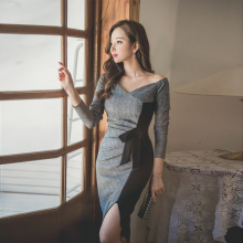 2016秋季新品韩版修身性感开衩V领长袖包臀拼色连衣裙中裙女