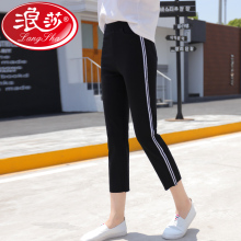 浪莎高腰哈伦裤女夏薄款韩版宽松九分裤萝卜裤两条白杠运动裤bf风