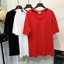超人气~时髦字母带挂脖短袖T恤女韩范套头V领春夏季宽松打底衫