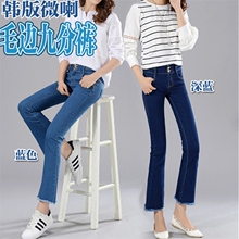 韩国毛边喇叭裤女牛仔长裤微喇流苏九分蓝色牛仔裤子女显瘦修身潮