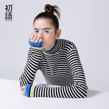 初语2017春季黑白条纹针织衫女薄款套头半高领修身毛衣长袖打底衫