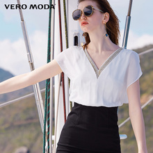 Vero Moda2017春季新品露肩荷叶袖雪纺拼接短袖上衣|317101511