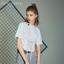 预售太平鸟女装2017夏装新款短款绑带纯色针织T恤女 修身短袖T恤