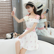 2017夏季新款甜美小清新翻边系带裙子一字领露肩吊带连衣裙8696S