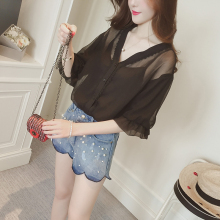 夏季新款性感v领喇叭袖雪纺衬衫女短袖宽松开衫打底吊带衫两件套