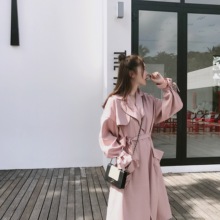 2017春季新款韩版宽松长袖翻领系带粉色风衣女中长款显瘦学生外套