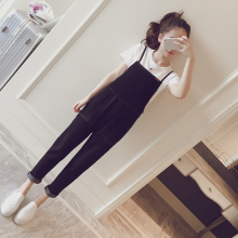 2017春装新款韩版黑色两件套背带裤女九分裤宽松显瘦休闲裤+送T恤