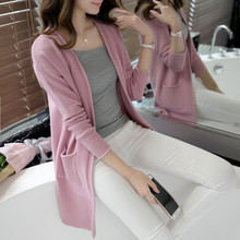 毛衣外搭开衫中长款口袋外套2016秋装新款女装韩版修身针织衫披肩