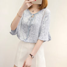 2017夏装新款小清新五分袖甜美荷叶袖碎花雪纺衫女喇叭袖上衣仙范