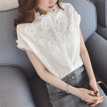 沐乃衣白衬衫女夏2017新款韩版百搭刺绣短袖衬衣木耳边立领上衣