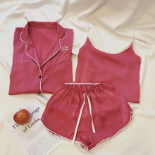 春夏季薄款长袖开衫睡衣套装女吊带背心+休闲短裤家居服三件套潮