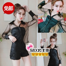 2017春装新款性感透视长袖衬衫上衣+纯色抹胸+百搭高腰短裤套装女
