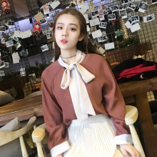 韩版时尚百搭休闲简约拼色宽松绑带领结长袖衬衫2017春装新款6184
