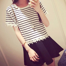 2017新款大码T恤女夏花边条纹短袖体恤宽松显瘦半袖上衣韩版学生