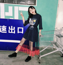 复古港风网纱拼接假两件连衣裙女 ulzzang宽松中长款蛋糕裙学生