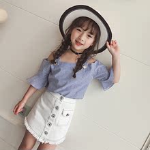 儿童上衣2017春装新款童装女童韩版一字领吊带时尚T恤中大童女