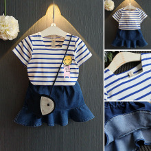 女童牛仔套装2017夏装新款小女孩条纹短袖T恤+宝宝牛仔短裙两件套