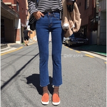 [ELINASEA]2016冬季显瘦基础款一粒扣百搭裤脚撕边微喇牛仔裤女