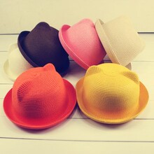 韩版超萌可爱猫耳朵草帽礼帽夏天女小熊亲子帽儿童遮阳帽沙滩帽子
