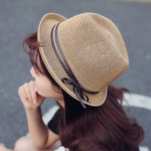 韩版帽子女夏天韩版潮英伦平檐小礼帽 遮阳爵士蝴蝶结草帽子