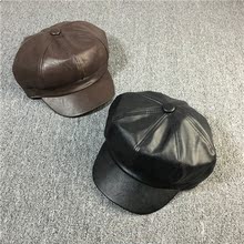 秋季新款PU皮质八角帽简约贝雷帽报童帽画家帽纯色皮帽子女遮阳帽