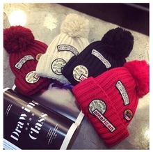 徽章贴标毛线帽子女潮嘻哈贴布字母毛球针织帽韩版秋冬加厚保暖帽