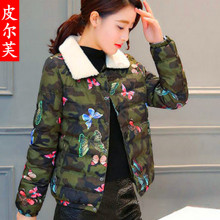 皮尔芙2016冬新款娃娃领印花羽绒棉服修身 外套棉衣女短款小棉袄