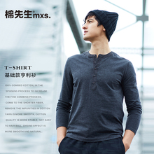 棉先生2017春装新款拼接亨利领纯棉T恤男长袖 男士纯色打底衫体恤