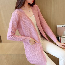 中长款镂空针织衫女士长袖外搭开衫宽松百搭毛衣外套春季2017口袋