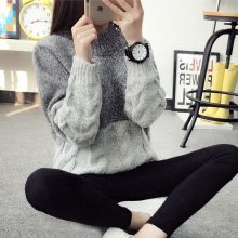 2016高领毛衣女秋冬韩版宽松套头毛衣外套女秋季加厚粗线慵懒拼色