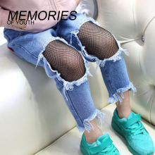 中小童装个性网袜破洞牛仔裤2017春夏新款女童时尚毛边休闲小脚裤