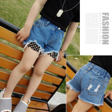 女童热裤2017夏季新款中小童装个性网格拼接不规则毛边牛仔短裤