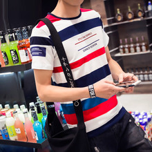 条纹短袖T恤男士韩版衣服潮流大码男装夏季圆领印花修身新款半袖