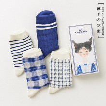 韩版个性方格女士中筒袜 秋冬全棉简约条纹棉袜 素色袜子女4双装