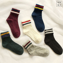 日系两条杠女士中筒袜 纯棉翻边堆堆袜短袜 原宿复古条纹潮袜子女