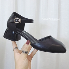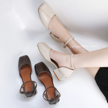 气质一字搭扣中空2017春秋夏季方头高跟粗跟女式凉鞋玛丽珍单鞋子