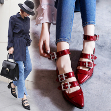红色玛丽珍鞋罗马绑带凉鞋中跟尖头复古漆皮粗跟一字扣百搭学生潮