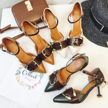 复古搭扣女尖头鞋包头中空细跟高跟鞋皮带扣韩版一字扣带女鞋凉鞋