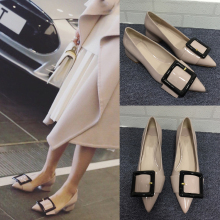 欧洲站2017春季新款漆皮尖头中跟单鞋 时尚百搭浅口方扣粗跟女鞋