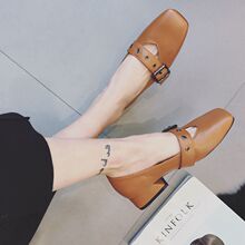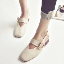 2017夏季新款女鞋后空浅口单鞋子中跟粗跟一字带扣方头沙滩凉鞋潮