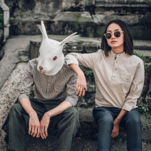 [Bytehare]自制复古条纹七分袖情侣衬衫男立领套头修身棉麻衬衣