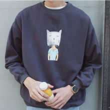 日系简约青年卡通印花抓绒长袖套头衫春季男士宽松圆领潮卫衣外套