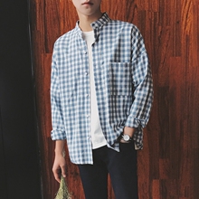 小清新格子百搭男士宽松长袖衬衫韩版青年春装立领衬衣潮衣服外套