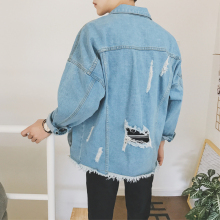 日系水洗毛边设计男士破洞落肩款牛仔衣春季青年宽松夹克衫潮外套