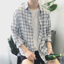 小清新日系简约青年格子控宽松衬衣春装新款男士潮流百搭长袖衬衫
