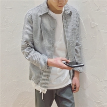 日系收缩下摆简约青年宽松竖条纹衬衣春季男士长袖衬衫潮衣服外套